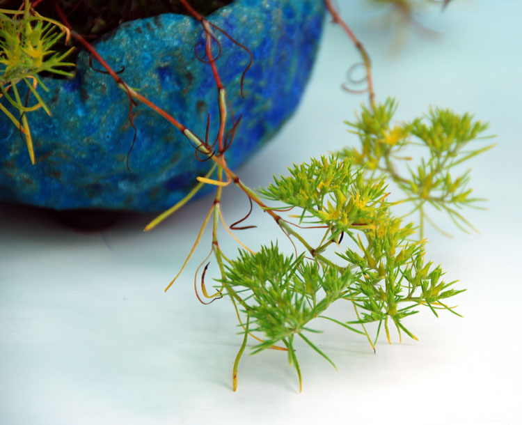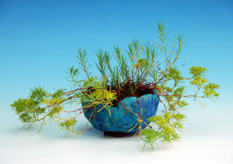 Am vollsonnigen Standort des Bonsai-Tisches entwickelt die Mauermiere zwischen Kiefern, Lärchen und Wacholdern im Sommer hübsche gelbe Blüten, die bis zum Oktober anhalten.