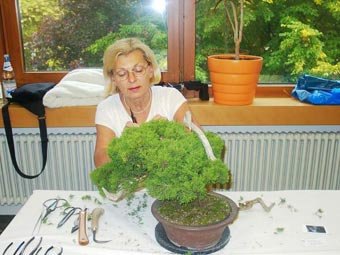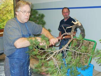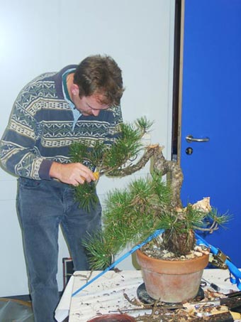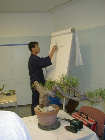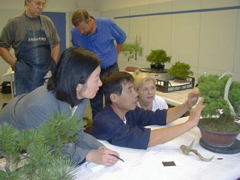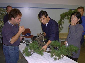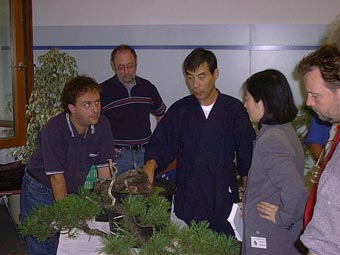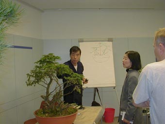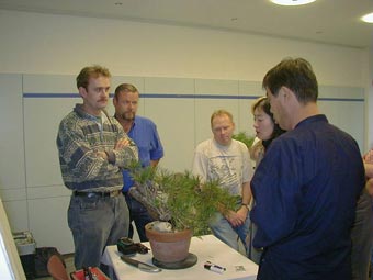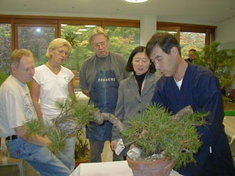 Im Rahmen der 7. Bayrischen Bonsaitage in ULM am 6./7. Oktober 2001 fand ein Workshop mit Kazuichi KOKUBO aus Tokyo statt. 8 Workshopteilnehmer aus Deutschland / Österreich versuchten unter der Anleitung des Japaners ihre selbstmitgebrachten Bäume bzw. Yamadoris zu gestalten. Leider war kaum ein Teilnehmer mit dem (nicht gerade billigen) Workshop und den Ergebnissen wirklich zufrieden. :o( Dafür erlebten wir ein tolles, gemütliches Ausstellungs-Wochenende in Ulm! - Danke an die Organisatoren!