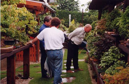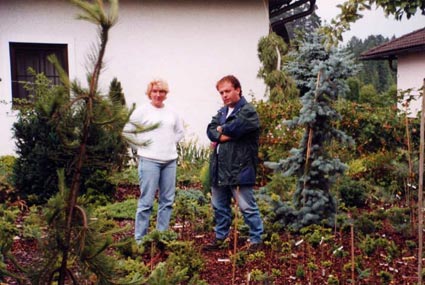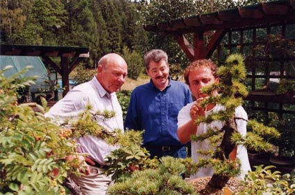 Da Pius Notter begeisterter Sammler von Hexenbesen-Pflanzen und Alpinum-Besitzer ist, lud ich ihn bei einem Boswil-Seminar nach Oberösterreich ein, um mit ihm den Hexenbesengarten von Franz Etzelstorfer in Pregarten zu besuchen. Kaum ein Jahr später - Mitte Juli 1999 - durfte ich Brigitte und Pius Notter sowie Sieglinde und Rolf Brinkmann (aus Landshut) in meiner Bonsaistube in Alberndorf begrüßen. Von Freitag Nachmittag bis Sonntag wurde über Bonsai fachgesimpelt, der Hexenbesengarten Etzelstorfer und Horst Heinzlreiter´s Bonsaigarten + Töpferstube besucht und das eine oder andere Tröpferl Rotwein gemeinsam verkostet. Notter´s zeigten sich positiv überrascht von der Qualität der österreichischen Bonsai und Yamadoris und Pius entschied sich spontan, Harald Lehner vorzuschlagen, dass auch aus Österreich einige Bäume am Weltkongress in München 2001 vertreten sein sollten. Alles in allem ein sehr gemütliches Wochenende mit unseren Freunden aus der Schweiz und Bayern !